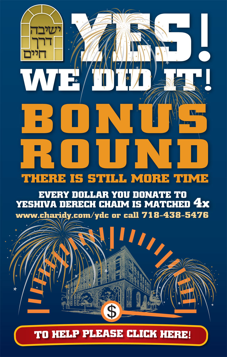 | Yeshiva Derech Chaim YES! WE DID IT!BONUS ROUND - THERE IS STILL MORE TIMEEvery dollar you donate to Yeshiva Derech Chaim is maatched 4x CLICK HERE to donate. |