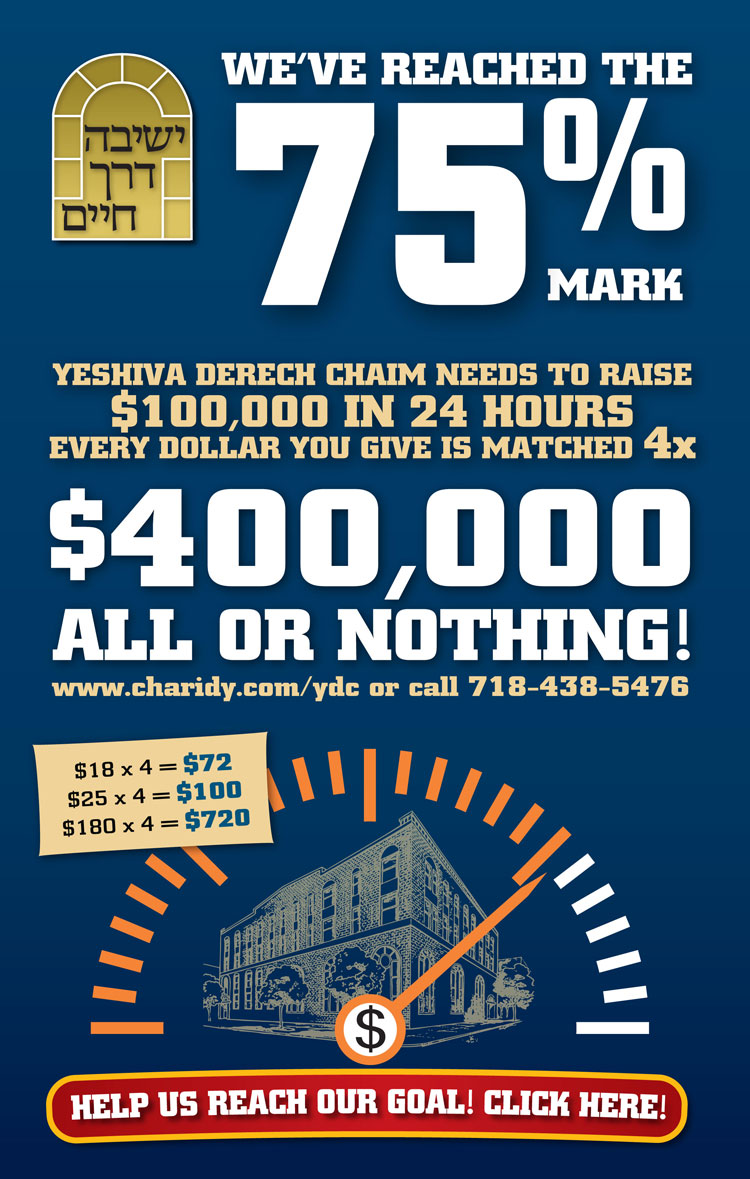 | Yeshiva Derech Chaim WE'VE REACHED 75%TODAY you have the power to forever impact the future of the our community and leadership by supporting the Torah study of our Talmidim at Yeshiva Derech Chaim.HOW IT WORKS: Every penny you donate is QUADRUPLED! For every dollar you give, the Yeshiva will get $4. Every dollar will be matched by our three generous benefactors, to help us reach our goal of $400,000 CLICK HERE to donate. |